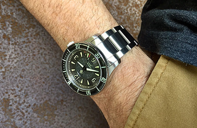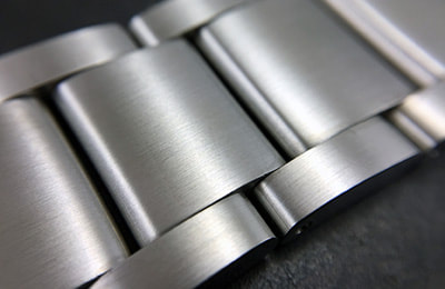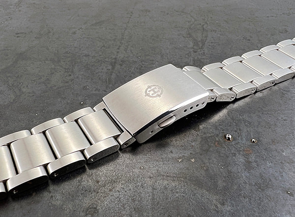 A modestly dressy three-link stainless bracelet with solid case links and a brushed top surface plus polished sides, the SS4 comes standard with the HELM Miyako. Three removable links on each side are secured with single sided screw pins for simple sizing adjustment.